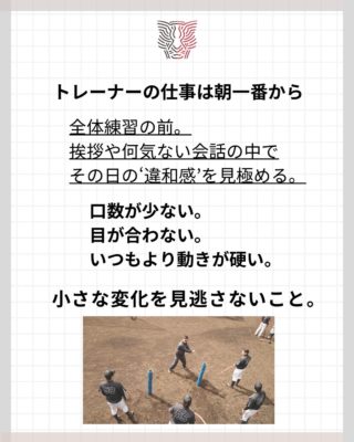 何か不安があったり体調が悪いと、選手は必ず口数が減ったり表情に出る。そういった小さな変化を見逃さないようにする。