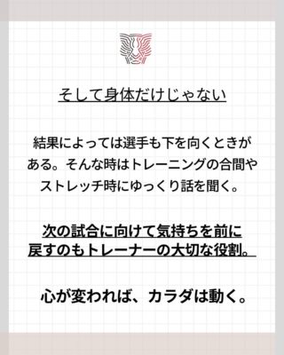 トレーニングの合間やストレッチ中にじっくり話を聞き気持ちを切り替えて次の試合に向かえるようにすることもトレーナーの大切な役割でした。